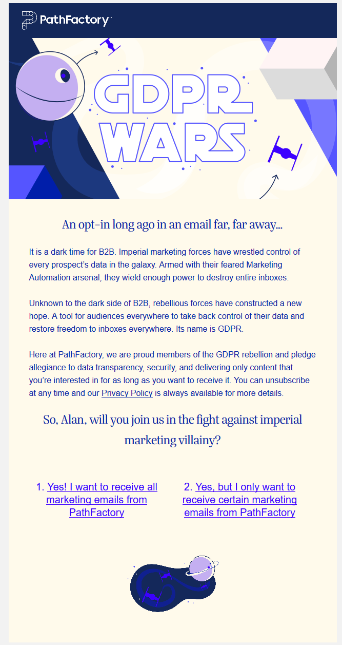 P.S. One small quibble with PathFactory is that they got the send date of their campaign wrong. Star Wars Day was two weeks ago, on May 4th. Although, given that was around the time they rebranded away from LookbookHQ I'll let that one pass just this once.